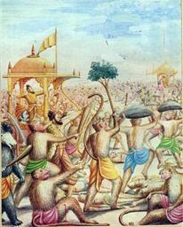 | Keywords: Killing of Rawana Painting by Balasaheb Pant Pratinidhi.jpg Loosing all generals nearest kith and kin Rawana finally decided to die or win and entered the battle field That was battle of the millennium Ravana was considered the greatest warrior of all times a boon he had a received by propitiating Shiva But Rama had a heavenly weapon which was handed over by sage Agastya with which he finally attacked Ravana and killed him 1916 object history credit line accession number Chitra Ramayana http //www kamat com/kalranga/mythology/ramayan/30045 htm PD-Art Uploaded with UploadWizard Rama fights Ravana Chitra Ramayana Balasaheb Pant Pratinidhi |