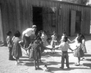 | Keywords: arizona mennoniteboardofmissions voluntaryservice emily wenger emilywenger kindergarten children games blackandwhite monochrome black and white Caption: Emily Wenger, Mennonite volunteer from Lynville, VA, teaching the kindergarten children new games. Stanfield, Arizona. 1962. Citation: Mennonite Board of Missions Photograph Collection. Mission to Arizona, 1950-1970. IV-10-7.2 Box 1 Folder 54 , photo #48. Mennonite Church USA Archives - Goshen. Goshen, Indiana. Caption: Emily Wenger, Mennonite volunteer from Lynville, VA, teaching the kindergarten children new games. Stanfield, Arizona. 1962. Citation: Mennonite Board of Missions Photograph Collection. Mission to Arizona, 1950-1970. IV-10-7.2 Box 1 Folder 54 , photo #48. Mennonite Church USA Archives - Goshen. Goshen, Indiana. |