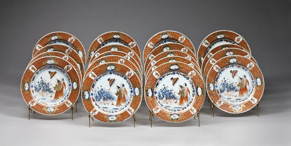 Keywords: Kinesiska porslinstallrikar, 1770-tal - Hallwylska museet - 99439.tif LSH artwork sv TALLRIK 18 st 6 flata och 12 djupa Dekor i underglasyrblÃ¥tt järnrött och guld i s k Kinesisk Imaristil med det s k Parasollmönstret efter förlaga av den holländske konstnären Cornelis Pronk I spegeln ett strandlandskap med tvÃ¥ kvinnor varav den ena en tjänarinna hÃ¥ller en parasoll över den andra som gör en gest mot tre fÃ¥glar framför en vassrugg <br/>Sannolikt gjrodes flera versioner av Parasollmönstret i dess Imariversion och de bör ha utförts omkring 1770-1775 De 18 talllrikarna i museets samling kommer ursprungligen frÃ¥n familjen Grill pÃ¥ GodegÃ¥rd i Östergötland <br/>Holländaren Cornelis Pronk 1691-1759 var bosatt i Amsterdam och där verksam som tecknare grafiker och mÃ¥lare Han anställdes av det holländska ostindiska kompaniet 1734-37 för att utföra förlagor till kinesiskt porslin Det s k Parasollmönstret är det mest kända av hans mönster <br/>Litt William R Sargent Treasures of Chinese Export Ceramics From the Peabody Essex Museum 2012 No 143<br/>Eighteen porcelain plates decorated in underglaze blue overglaze red and gilding<br/>Qing dynasty c 1770-75<br/>In 1734 the Dutch East India Company commissioned artist Cornelis Pronk 1691-1759 to produce drawings for sets of Chinese plates He produced four patterns among which this one of two ladies with a parasol was most popular The designs were copied in China in blue-and-white famille rose and as here in Imari colours and sold for extremely high prices in Europe The Dutch East India Company ended the contract in 1740 because production and shipping proved too expensive However Pronk ™s designs remained popular and were often reproduced in later years original caption Kinesiska porslinstallrikar 1770-tal <br/> Nyckelord Kinesiskt porslin FöremÃ¥lsbild Tallrikar - 1770 1775 HWY place of origin CN original filename hm_dig13744 14513 inventory number HWY XLVIII XI C h i 01 99439 CC-BY-SA Jens Mohr <gallery caption Different images of same object > File Kinesiska porslinstallrikar frÃ¥n 1770-talet - Hallwylska museet - 95890 tif </gallery> Porcelain of China Plates Chinese ceramics in the Hallwyl Museum Sweden Ceramics of Korea Ceramics of Japan Ceramics Jens Mohr Media contributed by LSH 2015-11 GodegÃ¥rds herrgÃ¥rd |