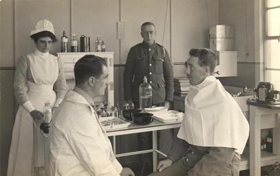 | Keywords: hospital king george military hospital kinggeorgemilitaryhospital postcards national library of medicine nationallibraryofmedicine people monochrome indoor Contributor(s): Zwerdling, Michael, former owner Publication: [England] : [publisher not identified], [1915] Language(s): English Format: Still image Subject(s): Hospitals, Military Physical Examination King George Military Hospital. Genre(s): Postcards Abstract: Black and white photograph of a doctor seeing a soldier, wearing a white cloth around his torso, in the throat and nose department at King George Military Hospital, London, England. A nurse and another member of the military are stadning behind a table that is covered with jars and medical instruments. Extent: 1 postcard : 9 x 14 cm Provenance: Purchase ; Michael Zwerdling ; 2004 ; 04-22. Technique: black and white NLM Unique ID: 101609960 NLM Image ID: D05812 Permanent Link: resource.nlm.nih.gov/101609960 Contributor(s): Zwerdling, Michael, former owner Publication: [England] : [publisher not identified], [1915] Language(s): English Format: Still image Subject(s): Hospitals, Military Physical Examination King George Military Hospital. Genre(s): Postcards Abstract: Black and white photograph of a doctor seeing a soldier, wearing a white cloth around his torso, in the throat and nose department at King George Military Hospital, London, England. A nurse and another member of the military are stadning behind a table that is covered with jars and medical instruments. Extent: 1 postcard : 9 x 14 cm Provenance: Purchase ; Michael Zwerdling ; 2004 ; 04-22. Technique: black and white NLM Unique ID: 101609960 NLM Image ID: D05812 Permanent Link: resource.nlm.nih.gov/101609960 |