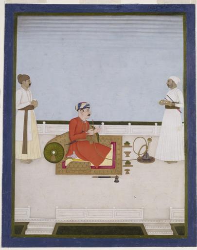 Keywords: King Gurgin Khan.jpg Artwork Dip Chand en Gurgin Khan is shown seated on a terace and smoking from huqqa In one hand he holds a small wine cup One of the two serving attendants stands facing him and holds a tray full of small wine cups Various courtly accessories have been placed tidely in a row in front of Gurghin Khan and also his battle axe has been placxed on the floor next to him ca other date - 1760 1763 gouache paper Institution Victoria and Albert Museum London object history en he subject of this picture formerly in the Fullarton collection is most likely the Armenian cloth-merchant Gregory hence Gurghin Khan who trained Nawab Mir Qasim's troops for their engagements with the British Raymond the translator of Ghulam Husayn's history gives the following acount of him 'Gurghin-qhan was a man born at Ispahan the capital of Persia and had a very remarkable physiognomy He was above the ordinary size strong built with a very fair complexion large black eyes full of fire an aquiline nose forming a ridge in the middle of its length and eyebrows very arched that joined together so as to form a point going downwards towards the nose Nothing was wanting to that man to render him capable of shining even in Europe but education; he owed everything to his own genius and nothing to art or cultivation ' Husayn 1789 II p 503fn Information field Place of origin Murshidabad India html exhibition history en Arts of Bengal Whitechapel Art Gallery 30/12/1979-30/09/2011 credit line en The painting is in the style of the Mughal provincial court painting in particular Murshidabad school accession number D 1180-1903 http //collections vam ac uk/item/O97215/an-officer-probably-gurgin-khan-painting-dip-chand/ Gurgin Khan seated smoking on a terrace PD-Art-100 Uploaded with UploadWizard Armenians in art Smoking in art Paintings in the Victoria and Albert Museum Hookahs in art |