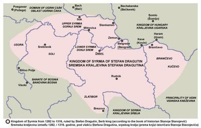 | Keywords: Kingdom of syrmia according to stanoje stanojevic.png en Kingdom of Syrmia from 1282 to 1316 ruled by Stefan Dragutin Serb king according to the book of historian Stanoje Stanojević sr Sremska kraljevina između 1282 i 1316 godine pod vlašću Stefana Dragutina srpskog kralja prema knjizi istoričara Stanoja Stanojevića own PANONIAN 2011 Cc-zero References Primary source Made according to the historical map from this book Stanoje Stanojević Istorija srpskog naroda Beograd 2009 map from this book can be also found here http //www dodaj rs/f/2h/wh/jqXNW7r/nemanjicskadrzava jpg Secondary sources http //img42 imageshack us/img42/8927/1353 png Similar map of Dragutin's realm from Croatian source http //www hercegbosna org/forum/povijest/hrvatska-povijest-u-kartama-t1419 html from book Hrvatska povijest u 25 karata written by Stjepan Srkulj and Josip Lučić http //www dodaj rs/f/1L/Lu/1NSQreXm/1353 png http //www dodaj rs/f/2i/vQ/1h9yeauE/dusan jpg http //www dodaj rs/f/3J/Ir/22O0Tjch/img1535 jpg Dr Aleksa Ivić Istorija Srba u Vojvodini Novi Sad 1929 page 6 Milojko Brusin Srpsko-hrvatski odnosi i Srbi u Hrvatskoj Novi Sad 2008 page 22 Maps of the history of Serbia in the 13th century Maps of the history of Serbia in the 14th century Maps of the Kingdom of Serbia medieval Maps of the history of Vojvodina Maps of the history of Syrmia Maps of the history of Mačva Maps of the history of Bosnia and Herzegovina in the Middle Ages Maps of the history of Republika Srpska Maps in Serbian Stefan Dragutin |
