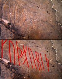 | Keywords: Kinneveds kyrka Runinskrift i kor-nisch 2010-04-22.jpg en Mediaeval runic inscription in Kinneved church in Frökind hundred Falköping municipality former Skaraborg county the Diocese of Skara Västergötland Sweden The runic inscription is found in a niche in the sanctuary a former sanctuary portal Transliterated the inscription seems to read kuþokurer or kuþokuare þ Malkolmsson read it as guðokurer and speculates that it means something like God cures In the lower half of the picture the runes are painted digitally Literature Dan Malkolmsson Om kyrkan i Kinneved och dess dolda tecken Falbygden No 60 2006 pages 79-87; Korta meddelanden Runor och andra putsristningar i Kinneveds kyrka i Västergötland Fornvännen No 102 2007 pp 37-40 Listed in Rundata as Vg Fv2007;37 sv Medeltida runinskrift i Kinneveds kyrka i Frökinds härad i Falköpings kommun i f d Skaraborgs län i Skara stift i Västergötland i Sverige Runinskriften finns i en nisch i korets södra vägg vilken ursprungligen var en koringång för prästen Runinskriften verkar translittrerad lyda kuþokurer eller kuþokuare þ Malkolmsson läser det som guðokurer och spekulerar i betydelser som Gud botar Bilden består av två likadana foton där runorna är ifyllda digitalt med Photoshop på den undre bilden Litteratur Dan Malkolmsson Om kyrkan i Kinneved och dess dolda tecken Falbygden nr 60 2006 sidorna 79-87 own Gunnar Creutz 2010-04-22 DEFAULTSORT VgFv2007;37 Cc-zero Interior of Kinneveds kyrka Medieval runic inscriptions in Sweden Falbygdens Museum Church Tours in April 2010 Photographs taken on 2010-04-22 Taken with Casio Exilim EX-Z100 Photos of churches by User Achird CC0 1 0 Files by Gunnar Creutz Runestones Västergötland 2010 in Falköping Municipality April 2010 in Sweden Churches in Sweden photographed in 2010 |