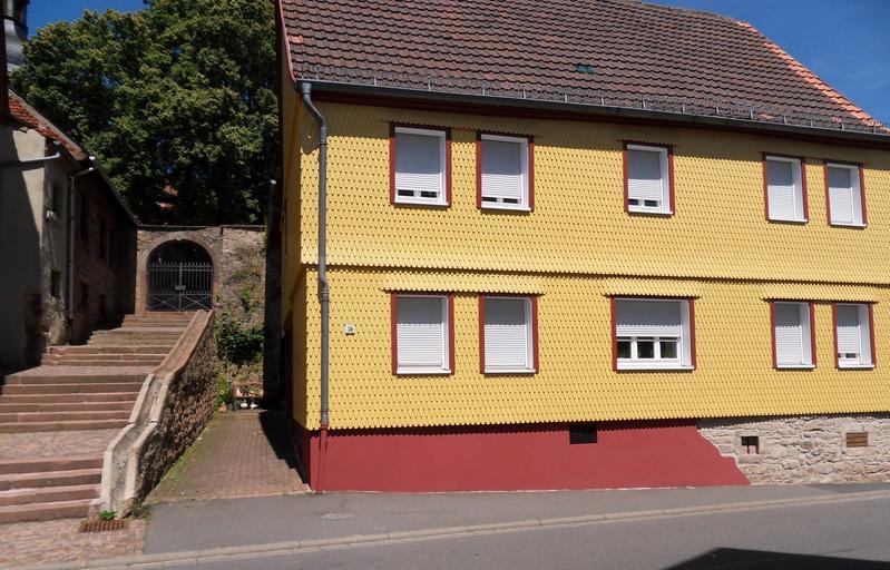| Keywords: KirchbrombachHauptstr30.JPG de Denkmalgeschütztes Fachwerkhaus mit verschindelter Fassade in der Hauptstraße 30 in Kirchbrombach mit der zum Kirchhof führenden Treppenanlage 10950 own Brühl 2010-07-08 Kirchbrombach Wooden shingle sidings in Germany Cultural heritage monuments in Brombachtal |