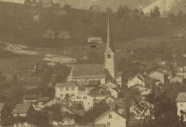 Keywords: Kirche Linthal Um 1870.jpg Detail of photo of Linthal showing reformed church Landesarchiv Glarus ~ 1870 Author Reformierte Kirche Linthal PD-old