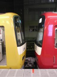 Keywords: Kissing yellow and red train.JPG en Keikyu yellow coloured train and red coloured train coupling at Kanazawa Bunko station ja 京 新1000形黄色と赤の 結 2014-09-12 18 35 29 own Hahifuheho cc-zero Uploaded with UploadWizard Keikyu 1000 series II