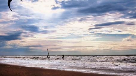 Keywords: kitesurfer kitesurfing dragons sport sea north sea sunset water sky water sports surf beach dunes summer clouds afterglow coastal protection