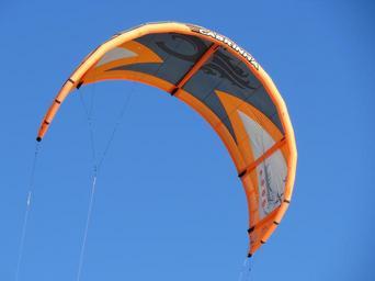Keywords: kitesurfing kiting water sports orange kite flying blue sky