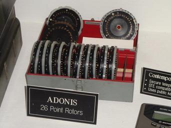 | Keywords: KL-7 ADONIS rotors - National Cryptologic Museum - DSC07935.JPG en Exhibit in the National Cryptologic Museum Fort Meade Maryland USA All items in this museum are unclassified; items created by the United States Government are not subject to copyright restrictions 2013-03-29 11 04 42 own Daderot cc-zero Rotor machines in the National Cryptologic Museum Uploaded with UploadWizard | ||||