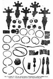 | Keywords: Klad Koloskovo foto.png ru Колосковский клад Госуда ственный исто ический музей К воо ужению и одежде воина относятся два небольших железных втульчатых копья се еб яная п яжка со щитком ге альдической фо мы и п о езная се еб яная бляшка для емня Остальные вещи относятся к нескольким аз озненным женским набо ам ук ашений Имеется пять пальчатых фибул щитки кото ых ук ашены ци кульным о наментом много целых и поломанных б онзовых б аслетов с ха акте ными асши енными концами часть г ивны и д угие вещи 2014-11-21 Рыбаков Б А Д евние усы // Советская а хеология жу нал «Издательство Академии наук СССР» 1953 XVII С 65 author other versions Custom license marker 2014 11 20 PD-Russia Uploaded with UploadWizard Valuyki |