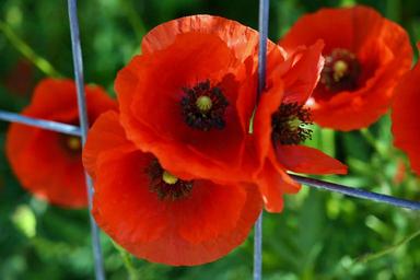 Keywords: klatschmohn poppy klatschrose papaver rhoeas red flowers grid poppy flower flower spring red nature caught break out lattice fence garden