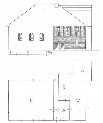 | Keywords: Klein-Schüttüber Synagoge.jpg cs Obrázek 111 str 138 Malá Šitboř bývalá synagoga 1808-1914 čelní pohled a půdorys legenda A - vstup na ženskou galerii B - pekárna K - modlitebna S - stodola W - obytná část de Abb 111 Klein-Schüttüber Synagoge 1808-1914 Frontale Ansicht und Grundriß Erklärung A Aufgang in der Frauenchor B Bäckerei K Kultraum S Scheune W Wohnung 1928 1930 Topographie der historischen und kunstgeschichtlichen Denkmale in den Bezirken Tepl und Marienbad 1932 Anton Gnirs 1873-1933 other versions File Gnirs Tepl p137-138 Klein-Schütübber djvu 50 0552778 12 5322222 Custom license marker 2015 05 12 PD-old Uploaded with UploadWizard Demolished synagogues in the Czech Republic Synagogues in Karlovy Vary Region Built in the Czech Republic in 1808 Destroyed in the Czech Republic in 1914 Malá Šitboř Gnirs TopographieTepl und Marienbad |