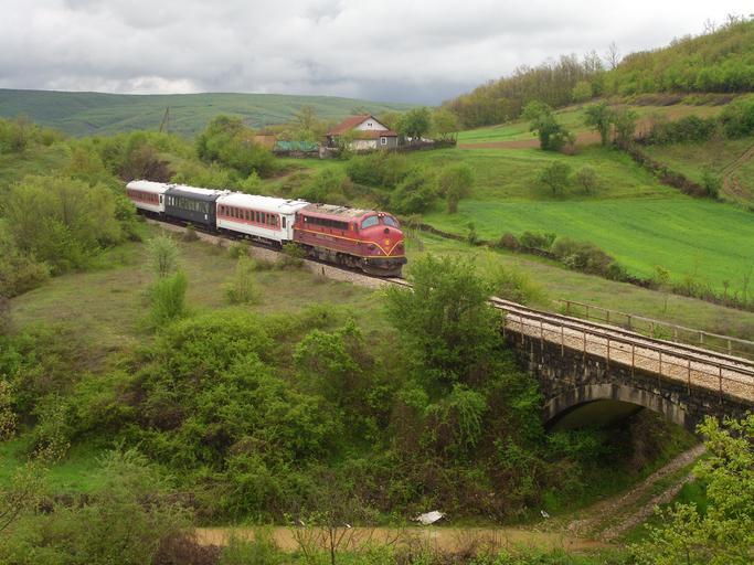Keywords: Klina river rail bridge.JPG NOHAB engine approaching a bridge over the Klina river east of Klinë Kosovo on a route from Fushë Kosovë 2014-04-25 11 27 14 own Jan Pešula cc-zero Uploaded with UploadWizard Rail transport infrastructure in Kosovo Klina Klina river HK 005-008