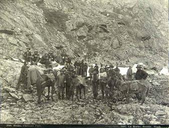 | Keywords: Klondikers resting at the Scales before ascending the summit of Chilkoot Pass, Alaska, 1897 (LAROCHE 302).jpeg Photograph Creator Frank La Roche Caption on image Scales Chilkoot Pass c1897 Scales Chilkoot Pass This is an extremely interesting spot It is at the foot of Chilkoot Pass and the last resting place prior to the ascent of Chilkoot on the northward trip The group shown in the picture includes several Indian packers After the long march from Dyea Point this hardy band of miners took a well merited rest at the foot of the pass The rocky background shown in the photograph is a slight indication of the hazardous climb in the prospect The climate and the occupation are not condusive to slender appetites and it will be seen that as soon as a halt was cried some of the men plunged into their provision sacks regardless of the fact that their photographs were being taken Frank La Roche En Route to the Klondike 1898 Klondike Gold Rush Subjects LCTGM Pack animals--Alaska--Chilkoot Pass Subjects LCSH Chilkoot Trail; Trails--Alaska; Chilkoot Pass Alaska ; Mountain passes--Alaska depicted place United States--Alaska--Chilkoot Pass 1897 Institution University of Washington UWASH-LAROCHE-source accession number laroche 302 PD-old-auto-1923 1936 Information field Order Number LAR206 Pack animals Chilkoot Pass 1897 in Alaska Black and white photographs |