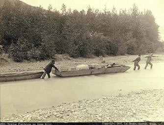 | Keywords: Klondikers towing supplies up Dyea River using flat bottomed boat, Chilkoot Trail, Alaska, 1897 (LAROCHE 308).jpeg Photograph Creator Frank La Roche Caption on image Towing provisions up Dyea River c1897 Twelve hundred pounds are here loaded upon a flat-bottomed boat which is being pulled and pushed upstream to the head of canoe navigation about six miles north of Dyea It exhibits another method of moving supplies With indescribable toil hundreds of men labored on from day to day in an almost frenzied effort to reach Dawson City before the freezing of the lakes and rivers beyond the mountain passes; and in their desperation at the slow process made some would abandon their outfits and push on trusting to luck and a well-filled purse to take them through while others would cache their supplies with the hope of finding them again if compelled to turn back Frank La Roche En Route to the Klondike 1898 Klondike Gold Rush Subjects LCTGM Flatboats--Alaska; Rivers--Alaska Subjects LCSH Chilkoot Trail; Trails--Alaska; Dyea River Alaska depicted place Alaska 1897 Institution University of Washington UWASH-LAROCHE-source accession number laroche 308 PD-old-auto-1923 1936 Information field Order Number LAR203 Flatboats Taiya River Chilkoot Trail Trails |