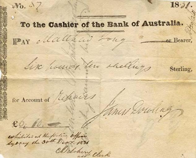 | Keywords: Knatchbull forgery 1831.jpg Forgery by John Knatchbull in 1831 In February 1832 Knatchbull was found guilty of false making forging and counterfeiting a certain order for payment of money in the name of Judge James Dowling The forged note appears here as an exhibit for the prosecution Knatchbull was found guilty and given a death sentence which was later commuted to seven years to be served on Norfolk Island http //www records nsw gov au/archives/convict_records_example_8290 asp State Records of New South Wales 1831 John Knatchbull public domain due to age PD-Australia PD-old Forgery History of Australia Law enforcement in Australia 1831 documents |