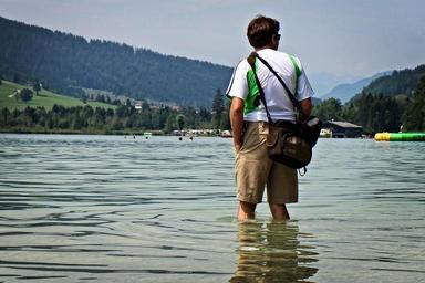 Keywords: kneippen treading water person water lake human nature out man cool down go stand individually portrait male view leisure recovery holiday