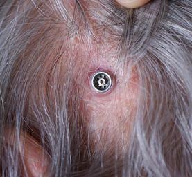 Keywords: Knochenleitungsimplantat.JPG de Implantierte Titanschraube um ein passendes Verstärkungsgerät anzuschliessen bone anchored hearing aid 2014-07-06 13 45 55 own TimotheusB cc-zero Uploaded with UploadWizard Bone anchored hearing aids