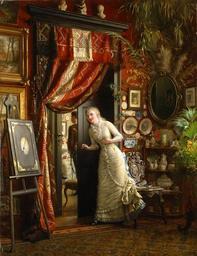Keywords: Knut Ekwall-Frieriet.jpg Artwork Creator Knut Ekwall 1880-1889 oil canvas Institution Nordiska museet Stockholm Sweden accession number object history credit line overdecorated Victorian interior woman joyfully eavesdropping www nordiskamuseet se PD-old-auto 1912 Knut Ekwall Marriage proposals in paintings People with mirrors in art Easels in art Women in rooms in art Eavesdropping in art Woman's clothes and fashion in painting 19th-century domestic interiors in painting 1880s 1880s paintings Images from Nordiska museet Red curtains in art
