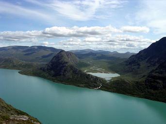 Keywords: Knutshøe.jpg The lake Gjende in Jotunheimen Norway and the Nature reserve on the right side of the mountain around the lake Knutshøe is the characteristic mountain Own 5/8-2003 Sondrekv Jotunheimen Vågå Gjende