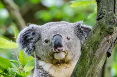 Keywords: koala bear tree face head sitting perched portrait grey fur wildlife nature looking cuddly mammal cute