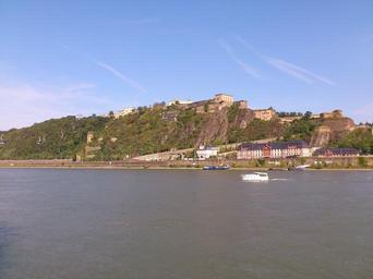 Keywords: koblenz ship ships view monument rhine sachsen ehrenbreitstein fortress river castle romance historical romantic blue sky rheinland germany city