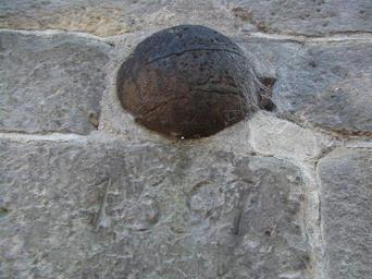 Keywords: Kogel kerk Ootmarsum.JPG en 1597 Canonball in the churchwal at Ootmarsum Netherlands nl 1597 Kanonskogel in de kerkmuur te Ootmarsum Nederland own Arch 2009 Ootmarsum Siege by Maurice of Nassau 1597 Ootmarsum 1597 in the Netherlands