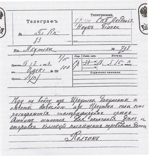 | Keywords: KolchaksTelegram.jpg ru Телег амма А В Колчака Иду на войну 2014-03-15 15 52 00 скан Синюков В В Александ Васильевич Колчак Ученый и пат иот в 2 ч / В В Синюков ; отв ед А П Лисицын ; Ин-т исто ии естествознания и техники им С И Вавилова РА аука 2009 ISBN 978-5-02-035739-6 unk PD-RusEmpire Uploaded with UploadWizard Aleksandr Kolchak World War I |