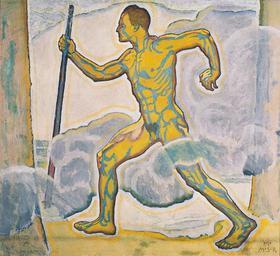 Keywords: Kolo Moser - Der Wanderer - ca1915.jpeg Der Wanderer oil canvas 197 x 217 cm Vokale kleiner geschrieben Wien Museum repro from artbook c 1915 Creator Koloman Moser PD-old Other versions Koloman Moser Paintings of nude standing males
