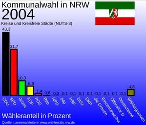 | Keywords: Kommunalwahl in NRW 2004.svg en Percentage of the political parties at the local elections in North Rhine-Westfalia in 2004 de Wähleranteil der Parteien bei der Kommunalwahl in Nordrhein-Westfallen 2004 own Vinom 2009-01-24 Geschenk an die Welt thumb 200px Flagge NRWs wurde verwendet Einschränkungen für die Verwendung der Flagge gelten weiterhin Local elections in North Rhine-Westphalia 2004 | ||||
