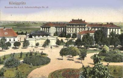 Keywords: Königgrätz InfKas.jpg de Kaserne des k u k InfRgt 18 in Königgrätz in Böhmen alte Postkarte Author circa 1900 1910 PD-old Austro-Hungarian Army barracks in Hradec Králové Infantry barracks of Austria-Hungary in Königgrätz Hradec Králové