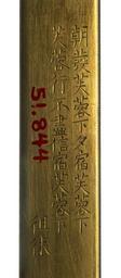 | Keywords: Kôno Haruaki - Kozuka with Mt Fuji - Walters 51844 - Mark A.jpg Mt Fuji is executed in silver with clouds at the lower right Mt Fuji is the most sacred mountain in Japan It has long been an important site for pilgrimage and is still a popular tourist destination On the reverse is a poem by the Japanese Confusian scholar Ogyû Sorai 1666-1728 1840 Edo shakudo silver cm 9 6 accession number 51 844 15688 William T / Henry Walters Collection Baltimore date and mode of acquisition unknown Walters Art Museum Henry Walters Acquired by William T or Henry Walters Date Tenpo kanoene taisô; Translation January 1840; Signature Haruaki Hôgen kao The Taste of Maryland Art Collecting in Maryland 1800-1934 The Walters Art Gallery Baltimore 1984 place of origin Edo present-day Tokyo Japan Walters Art Museum license Tosogu Japanese sword fittings in the Walters Art Museum Kôno Haruaki Media contributed by the Walters Art Museum needs category review |