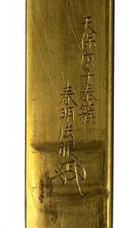 | Keywords: Kôno Haruaki - Kozuka with Mt Fuji - Walters 51844 - Mark B.jpg Mt Fuji is executed in silver with clouds at the lower right Mt Fuji is the most sacred mountain in Japan It has long been an important site for pilgrimage and is still a popular tourist destination On the reverse is a poem by the Japanese Confusian scholar Ogyû Sorai 1666-1728 1840 Edo shakudo silver cm 9 6 accession number 51 844 15688 William T / Henry Walters Collection Baltimore date and mode of acquisition unknown Walters Art Museum Henry Walters Acquired by William T or Henry Walters Date Tenpo kanoene taisô; Translation January 1840; Signature Haruaki Hôgen kao The Taste of Maryland Art Collecting in Maryland 1800-1934 The Walters Art Gallery Baltimore 1984 place of origin Edo present-day Tokyo Japan Walters Art Museum license Tosogu Japanese sword fittings in the Walters Art Museum Kôno Haruaki Media contributed by the Walters Art Museum needs category review |
