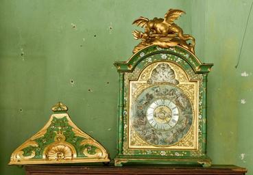 | Keywords: Konsolur, pendelur, foder av grönmålad furu med blom- och bladrankor i guld, silver, rött och blått - Skoklosters slott - 92376.tif LSH artwork Johann Eichstedt urmakare sv Dörr med glas Smala balustrar vid sidorna Halvrunt krön På ovansidan fastskruvat en skulpterad förgylld drake hållande fackla och pil <br/>Försilvrad cirkelformad urtavla med romerska timsiffror och kvartstimmesmarkeringar Timvisare av mässing fastsatt vid silvermedaljong med lieman i relief till vänster därom mindre medaljong med gosse blåsande såpbubblor till höger sovande gosse och timglas <br/>Runt urtavlan cirkelskiva av papp med personifikationer av solsystemet Apollon Venus Merkurius Månen Saturnus Jupiter Mars målade i flera färger Över cirkelskivan driven försilvrad mässingsbricka med hjälmkrönt fyrstyckad vapensköld en fågel stående åt vänster i varje fält Under vapnet stämplat EK Ephraim Kegenwart 1720-58 samt två kryss I svicklarna runt cirkelskivan förgyllda fastskruvade ornament <br/>Runt hus för urverket På urverket tre uppdragningsaxlar hjul för släphaksgång timkugghjul gjutna graverade beslag av förgylld mässing m m Liten pendel med mässingslod i ståltråd När pendeln svänger rör sig fyra små putti på två stålpinnar i rundeln innanför urtavlan Denna inre rundel täcks av celluloid Huset och det runda partiet runt om bemålat med naturalistiska rosor och tulpaner mot röd grund på locket en fågel <br/>Fodret skärt på insidan Bakre dörr på gångjärn Nyckel saknas <br/>Bronserade handtag på fodrets sidor <br/>Klockan har suttit förankrad med järnstång och en krok vid en vägg <br/>En nyckel till urverket En rostig nyckel till främre dörren<br/>Urverket signerat Johan Eichstedt Danzig <br/>Uret 1600- talets senare hälft fodret 1700- talets andra fjärdedel original caption Konsolur pendelur foder av grönmålad furu med blom- och bladrankor i guld silver rött och blått 1650-1675 <br/> Nyckelord Klocka 1600-tal Ur - 1650 1675 size mm 63 225 103 SKO E K place of origin original filename sm_dig9513 24503 inventory number SKO 3190 92376 CC-BY-SA Margareta Gaik Watches Margareta Gaik Media contributed by LSH unmatched creator Media contributed by LSH 2014-11 |