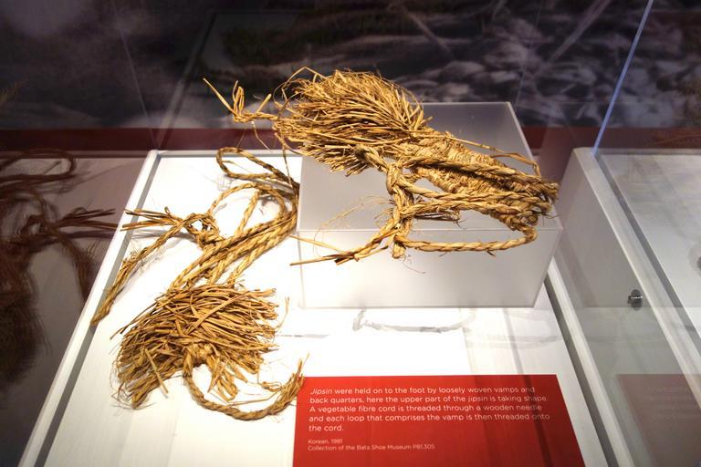 Keywords: Korean jipsin, partially woven upper part, 1981, rice straw - Bata Shoe Museum - DSC00387.JPG en Exhibit in the Bata Shoe Museum Toronto Ontario Canada The museum permitted photography without restriction 2013-07-04 11 01 59 own Daderot cc-zero Shoes in the Bata Shoe Museum Uploaded with UploadWizard Jipsin |