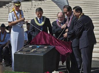 | Keywords: Korean War Veterans commemorative stone dedication ceremony 130215-N-WF272-132.jpg en Distinguished guests left to right Adm Samuel J Locklear III commander U S Pacific Command Eric K Shinseki secretary of Veteran Affairs Neil Abercrombie governor of Hawaii Sung Choon Park minister of Veteran Affairs of the Republic of Korea and Young-kil Suh Consul General of the Republic of Korea in Honolulu unveil the Korean War Veterans commemorative stone during the dedication ceremony at the National Memorial Cemetery of the Pacific The dedication ceremony was a tribute to Korean War veterans for their sacrifices and dedication as well as the 60th Anniversary of the Korean War Armistice U S Navy photo by Mass Communication Specialist 3rd Class Diana Quinlan 2013-02-15 Petty Officer 3rd Class Diana Quinlan https //www dvidshub net/image/872457 130215-N-WF272-132 2013-02-22 22 31 HONOLULU HI US PD-USGov-Military-Navy Samuel J Locklear Images from DoD uploaded by Fæ |