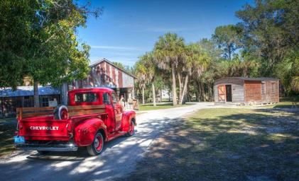 Keywords: koreshan state park cult florida yellow house 1900's empty home abandoned grass historic porch tropics wooden windows red 1947 chevy truck