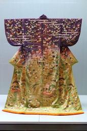 | Keywords: Kosode (garment with small wrist openings), view 1, Edo period, 19th century, stream, flowing plant, house and insect cage design on purple and light green tussah silk crepe ground - Tokyo National Museum - DSC05999.JPG en Exhibit in the Tokyo National Museum Tokyo Japan This artwork is old enough so that it is in the public domain 2013-09-03 00 25 45 own Daderot cc-zero Uploaded with UploadWizard Kosode in the Tokyo National Museum Crepes fabric | ||||