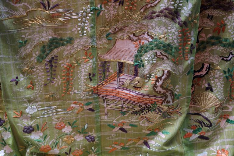 Keywords: Kosode (garment with small wrist openings), view 4, Edo period, 19th century, stream, flowing plant, house and insect cage design on purple and light green tussah silk crepe ground - Tokyo National Museum - DSC06004.JPG en Exhibit in the Tokyo National Museum Tokyo Japan This artwork is old enough so that it is in the public domain 2013-09-03 00 26 20 own Daderot cc-zero Kosode in the Tokyo National Museum Uploaded with UploadWizard Crepes fabric |
