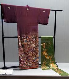 | Keywords: Kosode and obi, view 1, Edo period, 19th c. - kosode, house, fan, and landscape design on purple chirimen crepe background - obi, autumn grass design on light green satin ground - Tokyo National Museum - DSC06015.JPG en Exhibit in the Tokyo National Museum Tokyo Japan This artwork is old enough so that it is in the public domain 2013-09-03 00 27 48 own Daderot cc-zero Kosode in the Tokyo National Museum Uploaded with UploadWizard Chirimen | ||||