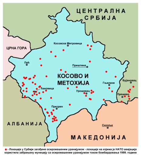 | Keywords: Kosovo uranium NATO bombing1999-sr.png en Sites in Kosovo and southern Central Serbia where NATO aviation used depleted uranium rounds during 1999 bombing sr Локације на Косову и југу Цент алне С бије на којима је АТО авијација ко истила заб ањену муницију са оси омашеним у анијумом током бомба довања 1999 године own PANONIAN 2014 Cc-zero References http //www jacksonprogressive com/issues/kosovo/chossudovsky_lowintensity html http //www jacksonprogressive com/issues/kosovo/targeted gif http //mondediplo com/IMG/arton2045 gif http //www journal forces gc ca/vo4/no1/research-recherch-eng asp http //kosova org/pics/maps/dukosom gif http //www srpskapolitika com/Nato/nato-genocid html http //www spc rs/sr/tajne_oruzja_sa_osiromasenim_uranijumom Večernje Novosti Utorak 18 maj 2010 strana 5 Maps of the history of Kosovo in modern times Maps of the history of Serbia in modern times Maps of the Yugoslav wars Kosovo War 1999 NATO bombing of Yugoslavia War crimes Depleted uranium Maps in Serbian |