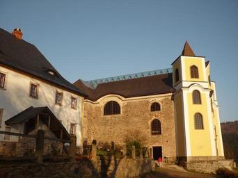 Keywords: Kostel v Neratove - s farou 1.JPG Kostel Nanebevzetí Panny Marie Neratov - vpredu fara Church in Neratov Czech Republic own 2009-10-31 Czech Wikipedia user Marzper Church of the Assumption of the Virgin Mary Neratov