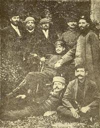 | Keywords: Kostur-MAVC-1913-1.JPG Косту ски войводи снимани п ез ап ил 1913 година в Ксанти п еди заминаването на Сбо ната па тизанска ота на акедоно-од инското опълчение П ави Т айко Желевски от Желево Пандо Сидов от Жупанища Андон Ю уков от Лабаница Тома Янакиев от Желин и Гео ги Шко онов Дякон Евстатий от ест ам Седналият е подпо учик Лаза Поповски Илюст ация Илинден 1913-04 Author Anonymous-EU IMARO Revolutionaries from Bulgaria Pando Sidov Georgi Shkornov Trayko Zhelevski Toma Zhelinski Macedonian-Adrianopolitan Volunteer Corps Andon Yurukov |