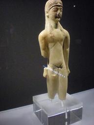 | Keywords: Kouros of Naucratis 1.jpg es Estatuilla de un kouros de yeso pintado versión en miniatura del kouros un prototipo de la escultura griega arcaica del siglo VI a C El cuerpo es una abstracción anatómica de un joven de excelencia física y moral areté cabello largo aristocrático hombros anchos cintura estrecha muslos fuertes y labios con una perenne sonrisa de satisfacción Conserva restos de pintura en el pelo y en el rostro Las esculturas de la época arcaica solían pintarse y había figuras masculinas como ésta que en ocasiones llevaban un bigote pintado Esta estatuilla probablemente manufactura chipriota procede de Naucratis Egipto Hacia 560 a C Medidas 257 mm x 88 mm x 44 mm GR 1888 1006 1 sculpture B438 own Dorieo 2009-04-16 Kouroi Naucratis Exposición La belleza del cuerpo MARQ 560s BC statues |