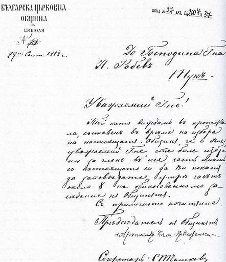Keywords: Kozma Prechistanski to Nikola Robev.jpg Писмо на Козма Дебъ ски 1835 - 1916 до икола Робев БЪЛГАРСКА ЦЪРКОВ А ОБЩИ А В Битоля 29-ий септ 1888 година До Господина Г-на Робев Тук Уважаемий Г-не Тъй като виждам в п отокола съставен във в еме на избо а на настоящата община че и Вие уважаемий Г-не сте биле изб ани за член в нея чест имам с настоящето си да Ви поканя да заопвядате ут е часът около 8 на обикновеното заседание на общината С п иличното почитание П едседател на общината А химанд ит Козма П ечистански scanned 1888-09-29 Kozma Prechistanski PD-old History of Debar Men of Bulgaria |