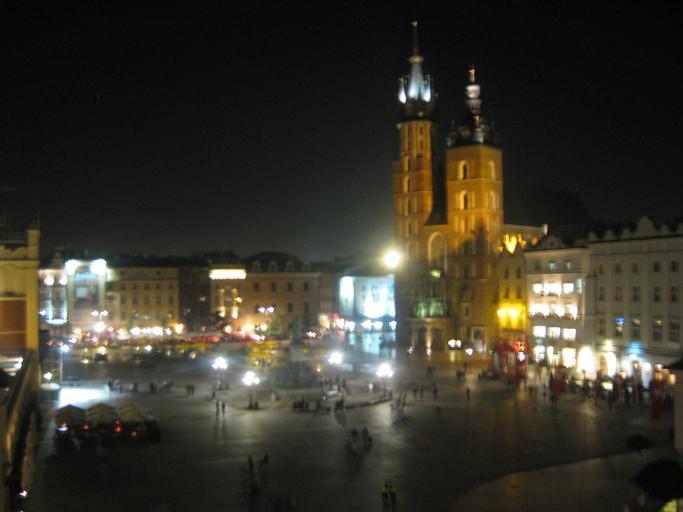 Keywords: Krakow Market Square at night 2008-09.jpg en Kraków Poland Market square at night own Martynaza 2008-09-28 cc-zero Exterior of Saint Mary Basilica in Kraków Illuminated buildings in Kraków