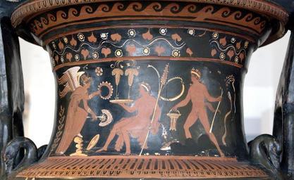 | Keywords: Krater naiskos Antikensammlung Berlin 1984.41 neck.jpg Dareios-Maler Darius Painter Grabszene Zechgelage des Todes B-Seites Hals des »Phrixos-Kraters« ein apulischer rotfiguriger Volutenkrater um 340 v Chr Funerary scene dead's libation Side B's neck of the Phrixos krater an Apulian red-figure volute-krater ca 340 BC Scène funéraire libation du mort Col de la face B du « cratère de Phrixos » un cratère à volutes apulien à figures rouges v 340 av J -C H 102 cm Museum Altes Museum Kompartiment XXIII Tarent case 7 Vasen aus einem Grab in Apulien object history credit line accession number Inv 1984 41 User Bibi Saint-Pol own work 2008 other versions <gallery> Image Krater naiskos Antikensammlung Berlin 1984 41 jpg Detail of side B Image Unteritalischer Grabfund rotfiguriger Vasen 5 JPG Full side B Image Krater by the Darius Painter Antikensammlung Berlin 1984 41 jpg Side A </gallery> Naiskos vases Volute kraters Darius Painter Red-figure pottery in the Antikensammlung Berlin Altes Museum Berlin - Kompartiment 23 340s BC Libation in ancient Greece and Rome Cultic practices in ancient Greek pottery |