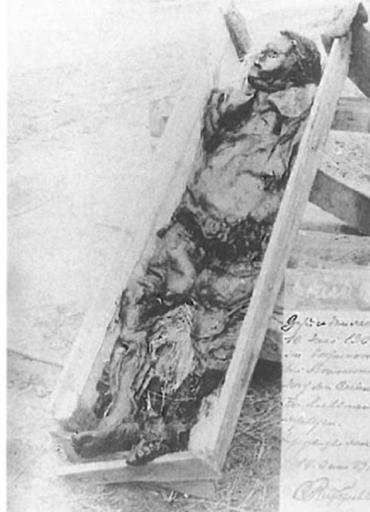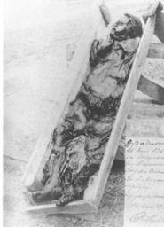 | Keywords: Kreepen Man.jpg Bog body Kreepen Man after his excavation in 1903 This is one of the many bog bodies that were found accross Grermany The remains of the body are not existing any more Die Moorleiche Mann von Kreepen nach der Ausgrabung 1903 Die à berreste der Moorleiche sind verschollen Scanned from Through Nature to Eternity written by Wijnand van der Sanden 1903 author Kreepen Man cropped jpg 80px Anonymous-EU Bog bodies Mann von Kreepen | ||||