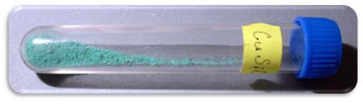 Keywords: Křemičitan měďnatý.PNG Křemičitan měďnatý - CuSiO3 own 2007-06-24 Ondřej Mangl Není nutno Copper compounds Metasilicates Samples of chemical compounds