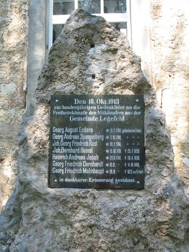 | Keywords: Kriegerdenkmal Legefeld.JPG de Kriegerdenkmal in Legefeld Thüringen en War memorial in Legefeld Thuringia Germany 2012-08-13 own Aschroet 50 93322 11 297762 339 Cc-zero cc-by-sa-3 0 Uploaded with UploadWizard War memorials in Weimar Legefeld Memorials of the Napoleonic Wars in Thuringia ImageNote 1 625 1157 1147 1137 2304 3072 2 Den 18 Okt 1913 zur hundertjährigen Gedenkfeier an die Freiheitskämpfe den Mitkämpfern aus der Gemeinde Legefeld Georg August Enders 21 2 1788 geblieben im Felde Georg Andreas Spangenberg 5 10 1790 Joh Georg Friedrich Rost 28 2 1784 Joh Bernhard Heinel 15 10 1791 25 7 1858 Heinrich Andreas Jacob 27 9 1794 26 4 1838 Georg Friedrich Gernhardt 12 12 4 10 1886 Georg Friedrich Mohnhaupt 26 11 1873 zu Erfurt in dankbarer Erinnerung gewidmet ImageNoteEnd 1 |